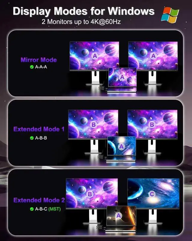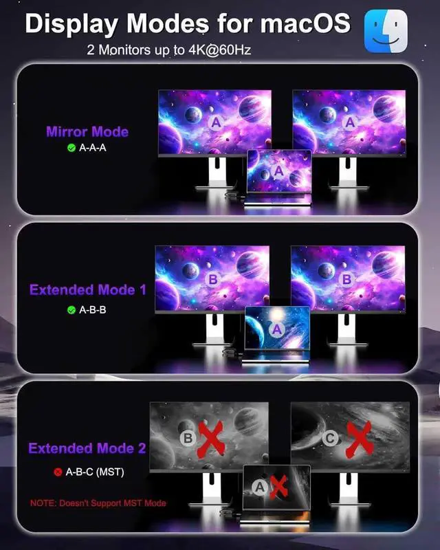 (NOTED: FIRST connect monitors to DP ports THEN connect adapter to laptop Set adapter as default audio output in system settings)Multiple Display ModesFor Windows OS this USB-C to Dual DP Ports adapter can supports two monitor to display different screensA-AAA-BBA-BC). For Mac OS it only support mirror modeA-AAA-BB and cannot extend two different screens due to Mac OS limitationWide CompatibilityThis dual monitor adapter works well with Thunderbolt 3/4 and DP Alt Mode compatible devices such as: XPS 13/15/17 HP Spectre x2/x360 Yoga 720/910/920/930 Surface Pro 7/X/Go/Laptop 3/4/5 MacBook Pro (2016 and later with compatible ports)
