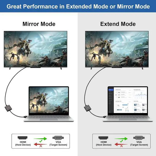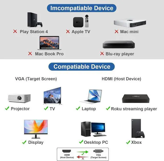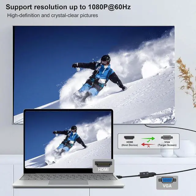 Note: It's not bi-directional converter and not able to transmit VGA computer to HDMI SignalThe HDMI male to VGA female adapter support max 1920x1080@60Hz (1080P Full HD) including 720p 1600x1200 1280x1024 for high definition monitors or projectors; Gold Plated Connector ensure better tranmission and resists corrosion. The HDMI to VGA dongle is compatible with HDMI equipped computer pc notebook ultrabook. Compatible with computer pc desktop laptop ultrabook notebook Chromebook Raspberry Pi Intel Nuc Roku PS3 Xbox One Xbox 360 Wii U Set Top Box TV BOX and otherThis HDMI to VGA Converter is portable. It can be easily take this lightweight HDMI to VGA Cable in your bag or pocket to do a business presentation with laptop and projector or extend desktop screen to a monitor. A VGA cable is required.