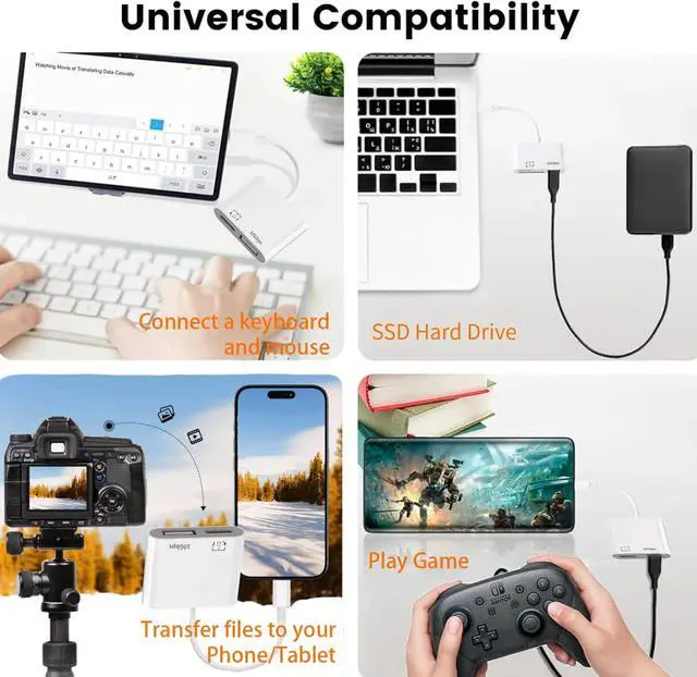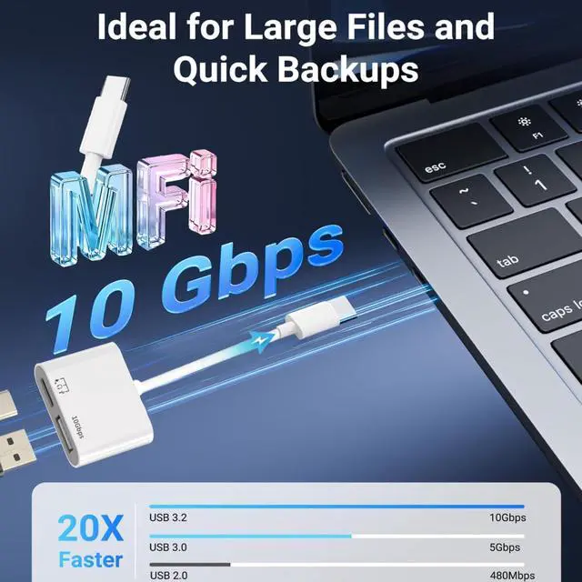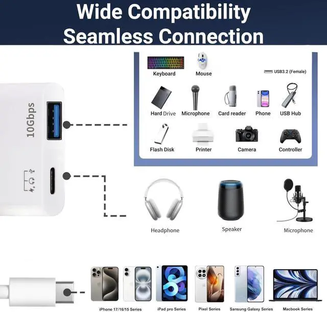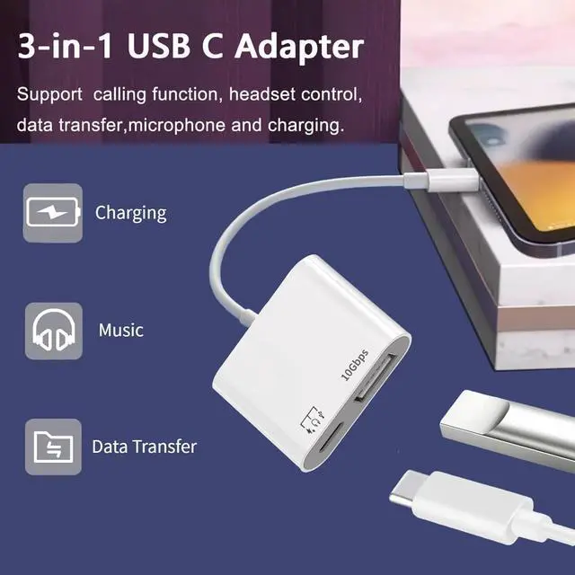 USB Adapter: MFi-certified USB-C to USB adapter with 10Gbps data transfer speed featuring USB 3.2 female port for seamless device compatibility. USB accessories to USB-C devices such as USB Flash Drive SSD Hard Drive keyboard hub mouse and more makes your USB C devices compatible with USB drives and any other USB devices that support OTG Enable smartphone/tablet/laptop to read or transfer data. 3 IN 1