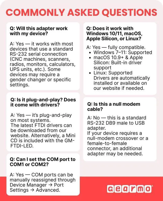 [ Wide Compatibility ]: Built with an FTDI Chipset. Works seamlessly with Windows 7 8 10 11 Linux and macOS 10. X making it a highly versatile solution across platforms. [