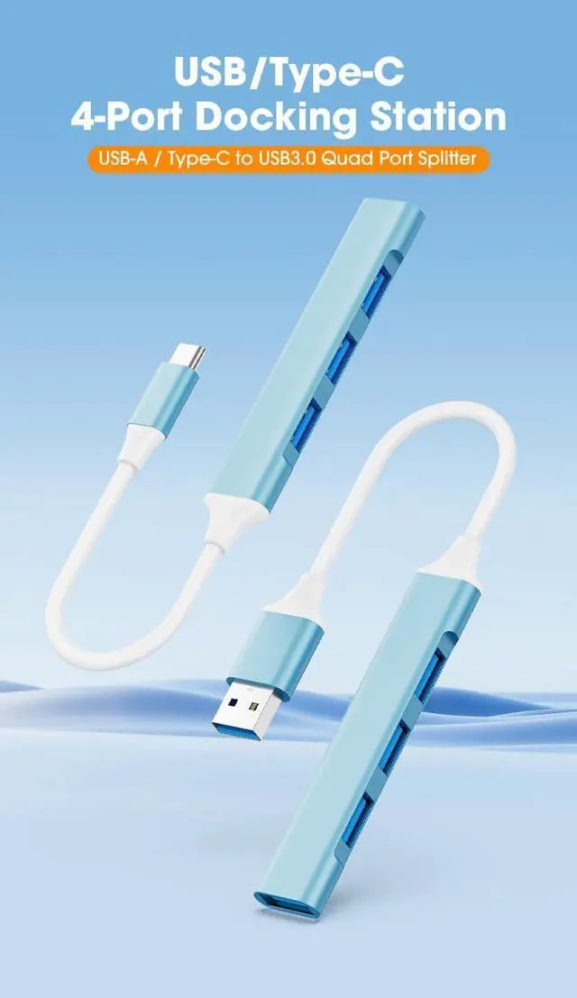 (Note: only one port supports USB 3.0 speeds; the others are USB 2.0. ) Perfect for boosting your laptops connectivity at home work or while traveling. Slim & Travel-Friendly Design Designed for portability this USB-C hub features an ultra-slim profile that fits easily into your laptop bag backpack or pocket. Whether you're commuting traveling or working remotely this compact USB hub adds essential expansion without adding bulk or clutter to your setup. Universal Compatibility Works flawlessly with all USB-C devices including MacBook Pro/Air iPad Pro Chromebooks and Windows laptops. Plug-and-play support means no drivers are neededjust connect and go. Compatible with macOS Windows and Chrome OS. Ideal for students business users and professionals. Durable Aluminum Build Crafted with a premium aluminum shell this USB hub provides better heat dissipation long-lasting durability and a sleek modern look. The metal casing not only protects your internal components but also makes this adapter a reliable part of your everyday tech toolkit. Built-In Protection Equipped with integrated over-current and short-circuit protection this USB-C hub ensures safe stable performance for all connected devices. Its designed to protect both the hub and your accessories from damage keeping your workspace efficient and your data safe.