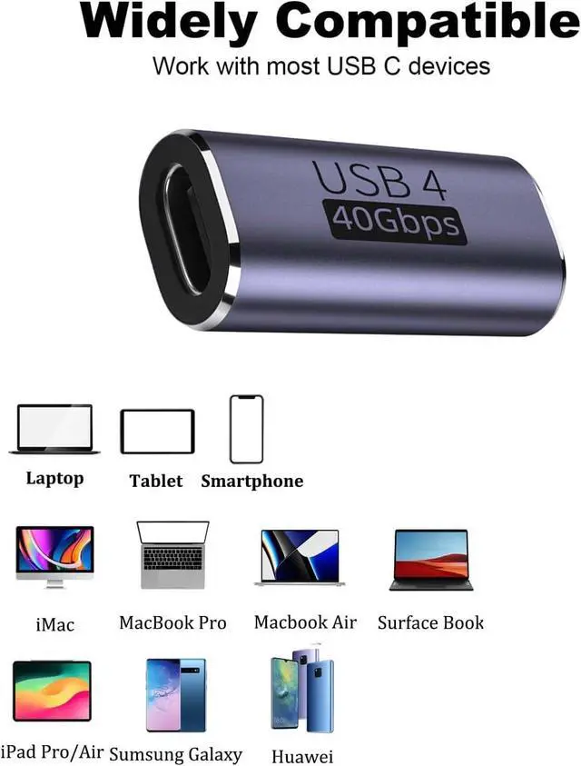[USB C female to female Coupler]This USB C female to female adapter easily combines two shorter USB-C cables when you need to extend the length of a USB-C cable for fast charging data transfer or video. It designed for ultimate convenience and ease of. [40Gbps Fast Data Transfer]This USB Type C coupler meets the USB4 adapter standard. The usb c female to female supports data transfer speeds of up to 40Gbps. You can transfer movies music etc. in just a few seconds. Note that the data transfer speed also depends on whether the USB device and cable support it.