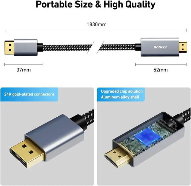 EXCELLENT TRANSMISSION: Benfei DisplayPort to HDMI 6 Feet Cable utilizes better chip solution and professional multiple shielding for instaneous and accurate data streaming. SUPERIOR STABILITY - Built-in advanced IC chip converts DisplayPort signal to HDMI signal; It is NOT a bi-directional converter and cannot transmit signals from HDMI to DisplayPortINCREDIBLE PERFORMANCE - The DisplayPort male to HDMI Male converter supports resolutions up to 3840*2160@30Hz 1920x1080@60Hz (1080p Full HD) including 720p 1600x1200 1280x1024 for high definition monitors or projectors supports flawless audio pass-thru for uncompressed digital 7.1 5.1 or 2 channels; Gold plated DisplayPort connector resists corrosion and abrasion and improve the signal transmission performance; Molded strain relief increases cable durabilityULTRA