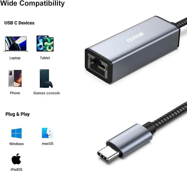 Reliable & Endurance ConnectivityDesigned specifically for plug-and-play connection between USB-C devices and wired network provides gigabit ethernet connectivity even when wireless connectivity is Inconsistent or over extended. Surfing at Full SpeedObtain stable connection speeds up to 1Gbps; downward compatible with 100Mbps/10Mbps networks. Our Type-C to LAN Gigabit Ethernet (RJ45) Network Adapter supports large downloads at maximum speeds without interruption.? To reach 1Gbps make sure to use CAT6 & up Ethernet cables. Compact & Friendly DesignCompact and lightweight with a user-friendly non-slip design for easier plug and unplug. Braided nylon cable for extra durability.