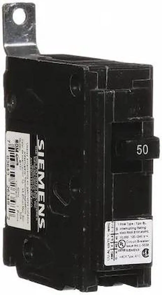 Miniature Circuit Breaker, Amps 50 A, AC Voltage Rating 120/240V AC, Circuit Breaker Type Standard, Number of Poles 1, DC Voltage Rating Not Rated, Circuit Breaker Actuator Toggle, Circuit Breaker Mounting Style Bolt On, Compatible Panelboard/Load Center Series P1, Phase Single, Series BL, Max. AIR Rating 10kA at 120/240V AC, For Use With Siemens P1 Panelboards, Terminal Connection Lug, Frame Size 125A/BL, Length 3.57 in, Width 1 in, Depth 3 in, Min. Wire Size 8 AWG. This item has been restricted from sale in the following state (s): []