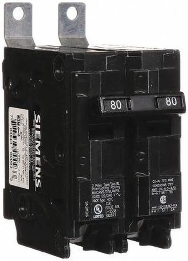 Miniature Circuit Breaker, Amps 80 A, AC Voltage Rating 120/240V AC, Circuit Breaker Type Standard, Number of Poles 2, DC Voltage Rating Not Rated, Circuit Breaker Actuator Toggle, Circuit Breaker Mounting Style Bolt On, Compatible Panelboard/Load Center Series P1, Phase Single, Series BL, Max. AIR Rating 10kA at 120/240V AC, For Use With Siemens P1 Panelboards, Terminal Connection Lug, Frame Size 125A/BL, Length 2 in, Width 3 in, Depth 4 in, Min. Wire Size 2 AWG (Al), 4 AWG (Cu).