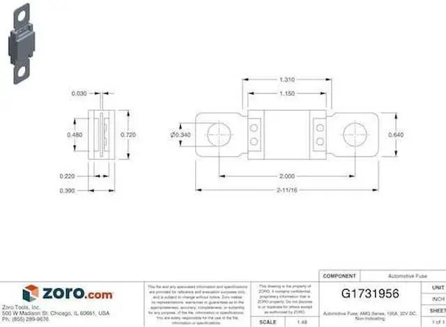 Automotive Fuse, 100 A, Non-Indicating, AMG Series, Not Applicable, 32 V DC, Fast-Acting, Body Material Plastic, Non-Rejection, Body Style Bolt-On, Interrupt Rating 1kA at 32V DC, Color Code Black, Fuse Size 2-11/16 in L x 5/8 in W x 11/32 in D, Length 2 11/16 in, Width 5/8 in, Depth 11/32 in, Equivalent Brand and Series Bussmann AMG, Littelfuse 298, Equivalent Series 298, AMG, Single Element, Compatible Fuse Block Series HME. This item has been restricted from sale in the following state (s): []
