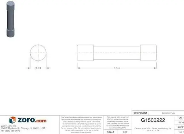 Fuse, 5 A, 250 V AC, 125 V DC, ABC Series, Non-Indicating, Fast-Acting, Body Style Cylindrical, Non-Rejection, Interrupt Rating 10kA at 125V AC, 10kA at 125V DC, 200A at 250V AC, Fuse Size 1-1/4 in L x 1/4 in dia, Length 1 1/4 in, Diameter 1/4 in, Equivalent Brand and Series Bussmann ABC, Littelfuse 314, Mersen GAB, Equivalent Series 314, ABC, GAB, Body Material Ceramic, Compatible Fuse Block Series 3823, HFA, HHN, HK, HKP, HPF, HRK, HTB, S-8000, Single Element.