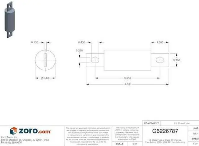 Fuse, 100 A, 600 V AC, 450 V DC, Class J, DFJ Series, Non-Indicating, Fast-Acting, Body Style Bolt-On, Fits Fuse Block Style Non-Rejection, Interrupt Rating 100kA at 450 V DC, 200kA at 600 V AC, Fuse Size 4-5/8 in L x 1-1/8 in dia, Length 4 5/8 in, Diameter 1 1/8 in, Equivalent Brand and Series Bussmann DFJ, Littelfuse LDFJ, Mersen HSJ, Equivalent Series DFJ, HSJ, LDFJ, Compatible Fuse Block Series JM600, Body Material Melamine, Single Element.