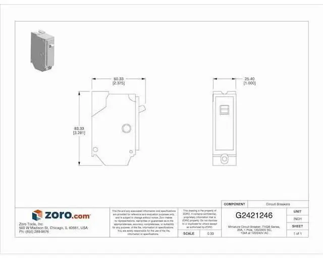 Miniature Circuit Breaker, Amps 20 A, AC Voltage Rating 120/240V AC, Circuit Breaker Type Standard, Number of Poles 1, DC Voltage Rating Not Rated, Circuit Breaker Actuator Toggle, Circuit Breaker Mounting Style Bolt On, Phase Single, Series THQB, Max. AIR Rating 10kA at 120/240V AC, For Use With Lighting Panels, Load Centers, Terminal Connection Screw Clamp, Frame Size 100A/THQ, Length 3.53 in, Width 1 in, Depth 3.28 in, Min. Wire Size 12 AWG (Al), 14 AWG (Cu), Max.