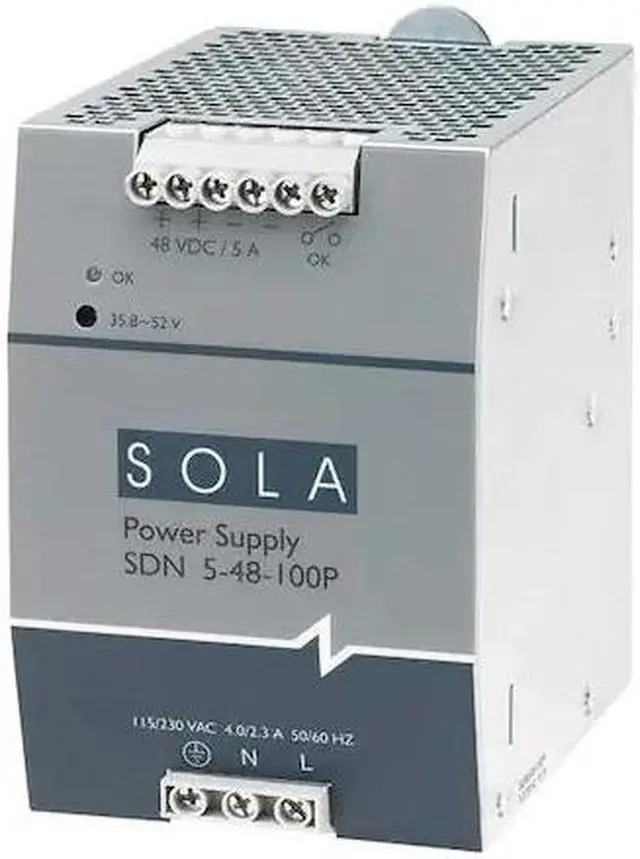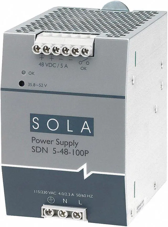 DC Power Supply, Input Voltage 115 to 230V AC, Output Voltage 48V DC, Power Rating 240W, Output Amps 5, Mounting DIN Rail, Switching, Case Material Metal Case, Height 4.88 in, Width 3.23 in, Depth 4.55 in, Series SDN-P, Hz 60, Phase - Electrical 1, Peak Amps 5.5, IP Rating 20, Output Noise Less Than 50mV, Hold Up Time Greater Than 20 msec, Status Indicator Green LED, NEMA Rating 1. This item has been restricted from sale in the following state (s): []