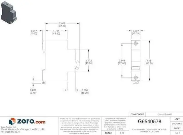 IEC Supplementary Protector, Amps 2 A, AC Voltage Rating 240/415V AC, Max. AIR Rating 14kA at 120/240V AC, Series C60SP, Curve Type C, DC Voltage Rating 60V DC, Number of Poles 1, Phase 1, Circuit Breaker Actuator Toggle, Circuit Breaker Mounting Style DIN Rail, Meets UL Type UL 1077, Terminal Connection Screw Clamp, Trip Type Thermal Magnetic, Application Branch Circuit Protection, Min. Wire Size 18 AWG, Max. Wire Size 8 AWG, Length 3.19 in, Width 0.71 in, Depth 2.83 in.
