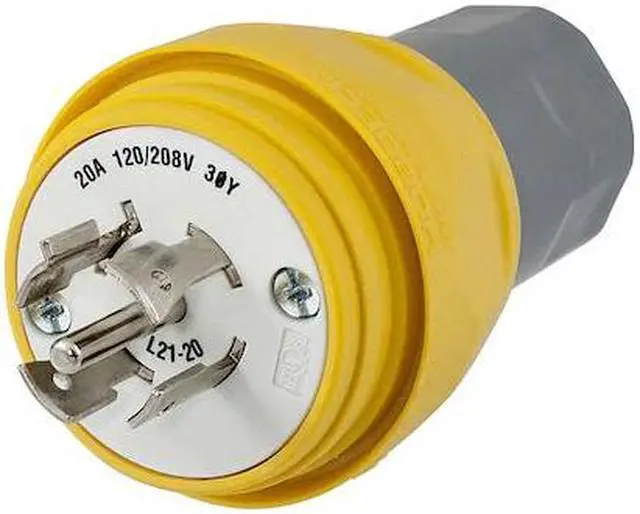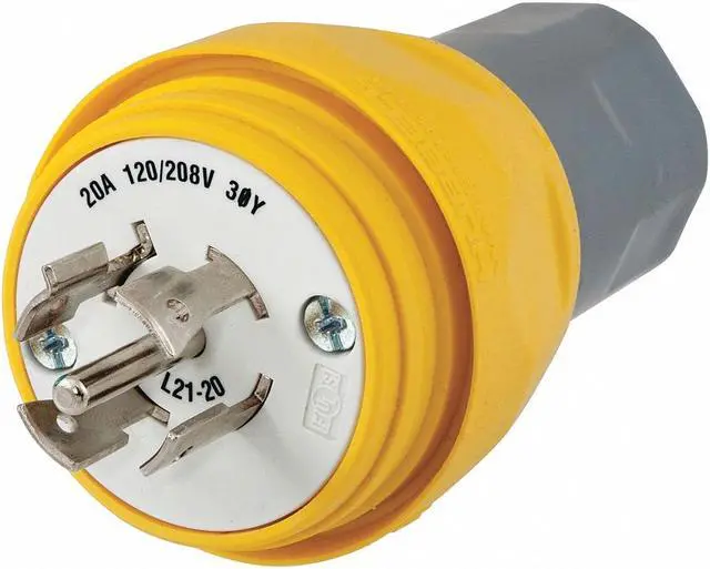 Watertight Locking Plug, Connection Orientation Straight, Current Rating 20 A, Housing Color Yellow, Housing Material Thermoplastic Elastomer, NEMA Plug Configuration L21-20P, Number of Blades 5, Number of Poles 4, Phase Three, Polarized Yes, Resistance Properties Chemical Resistant, Impact Resistant, Watertight, Voltage Rating 120/208V AC, Wire Connection Type Screw Terminals, Wiring Style Standard, For Maximum Cable Diameter 0.875 in, For Minimum Cable Diameter 0.375 in, Grade Industrial. This item has been restricted from sale in the following state (s): []