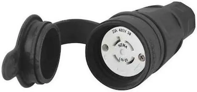 The HUBBELL 20A Watertight Locking Connector (L16-20R) is a three-pole, four-wire connector body designed for industrial and commercial electrical applications requiring watertight connections. Rated for 480V AC and 20 amps, this connector features a smooth thermoplastic elastomer housing that simplifies washdown processes and minimizes debris collection. It is grounded, shrouded, and includes corrosion-resistant stainless steel hardware to support use in demanding environments.