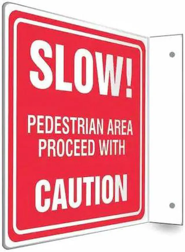 High Visibility Safety Sign, L-Shape Projection, Number of Printed Sides 2, English, Sign Format Other Format, Sign Legend Slow! Pedestrian Area Proceed With Caution, Sign Legend Background Color Red, Sign Legend Style Text