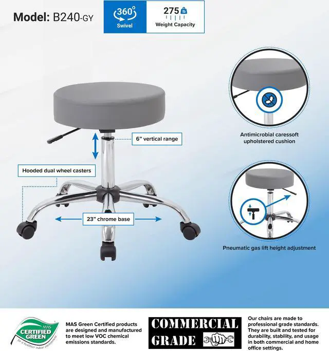 A medical drafting stool from our large offering of office chairs. Featuring chrome pneumatic gas lift- chrome base- and upholstered in durable Caressoft vinyl the B240 combines style and function