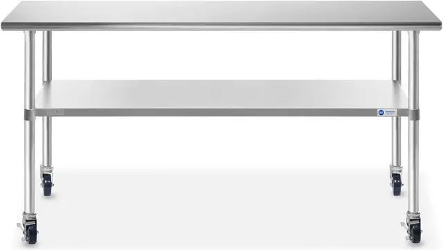 This heavy-duty table by GRIDMANN is constructed from 18-gauge #430 stainless steel, and is the perfect work surface for use in a kitchen, bar, restaurant, laundry, school, hospital, or any other commercial setting. It is NSF certified to meet strict standards for public health protection and built for high-volume use to last a lifetime. This stainless steel table features an extra heavy-duty top, an adjustable-height galvanized under-shelf, and galvanized legs with adjustable non-marring feet that eliminate table wobble on uneven floors. The edges on the front and back of the tabletop are rounded for working comfort.