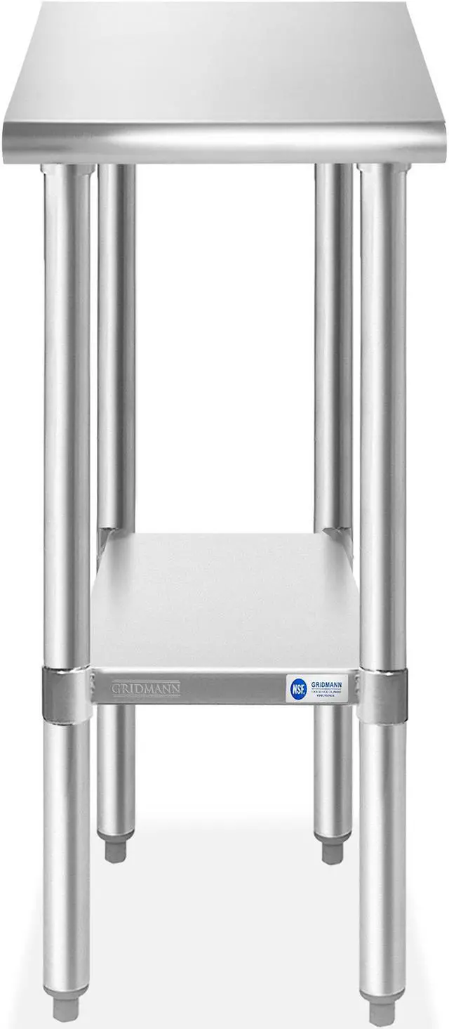 This heavy-duty table by GRIDMANN is constructed from 18-gauge #430 stainless steel, and is the perfect work surface for use in a kitchen, bar, restaurant, laundry, school, hospital, or any other commercial setting. It is NSF certified to meet strict standards for public health protection and built for high-volume use to last a lifetime. This stainless steel table features an extra heavy-duty top, an adjustable-height galvanized Undershelf, and galvanized legs with adjustable non-marring feet that eliminate table wobble on uneven floors. The edges on the front and back of the tabletop are rounded for working comfort.
