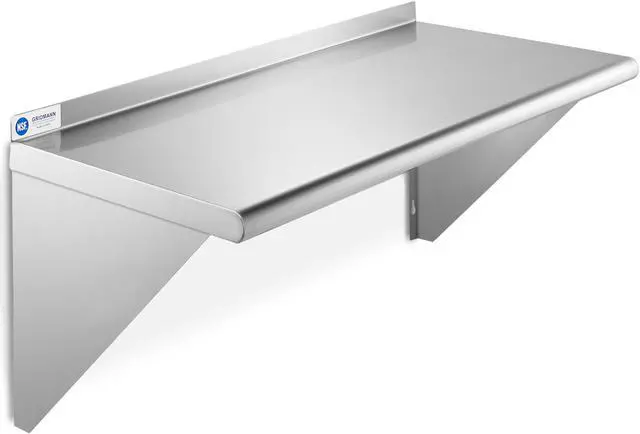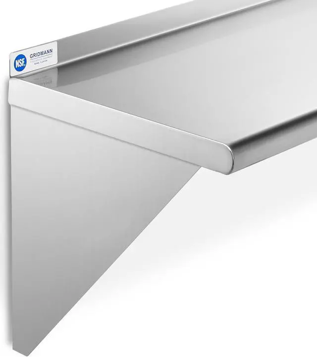 This heavy-duty wall mount shelf by Gridmann is constructed from 18-gauge #430 stainless-steel and is perfect for use in any kitchen, laundry, janitorial room, garage, or anywhere additional storage is needed. It is NSF certified to meet strict standards for public health protection and built for high-volume use to last a lifetime. It features a large, space-saving design that offers plenty of storage as well as a 1-1/2" tall backsplash. The front edge is rounded for working comfort and two wall support brackets provide maximum stability.