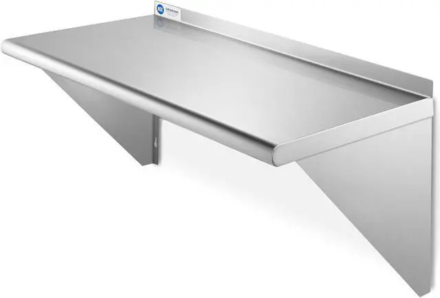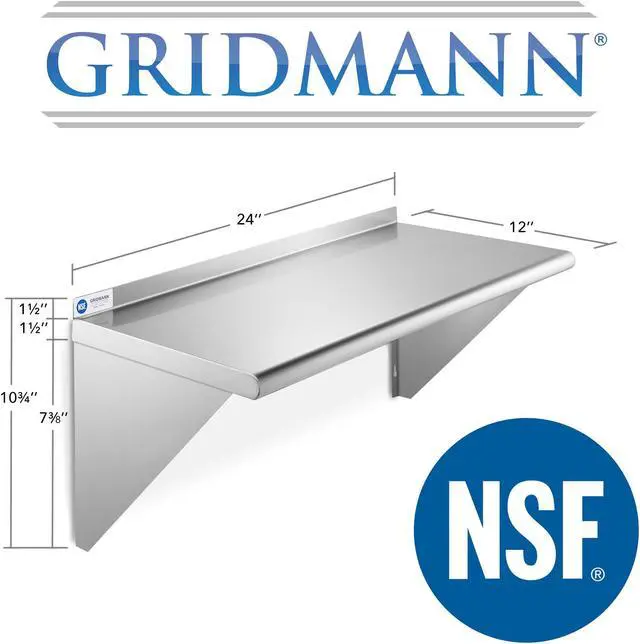 This heavy-duty wall mount shelf by Gridmann is constructed from 16-gauge #430 stainless-steel and is perfect for use in any kitchen, laundry, janitorial room, garage, or anywhere additional storage is needed. It is NSF certified to meet strict standards for public health protection and built for high-volume use to last a lifetime. It features a large, space-saving design that offers plenty of storage as well as a 1-1/2 inch tall backsplash. The front edge is rounded for working comfort and two wall support brackets provide maximum stability.