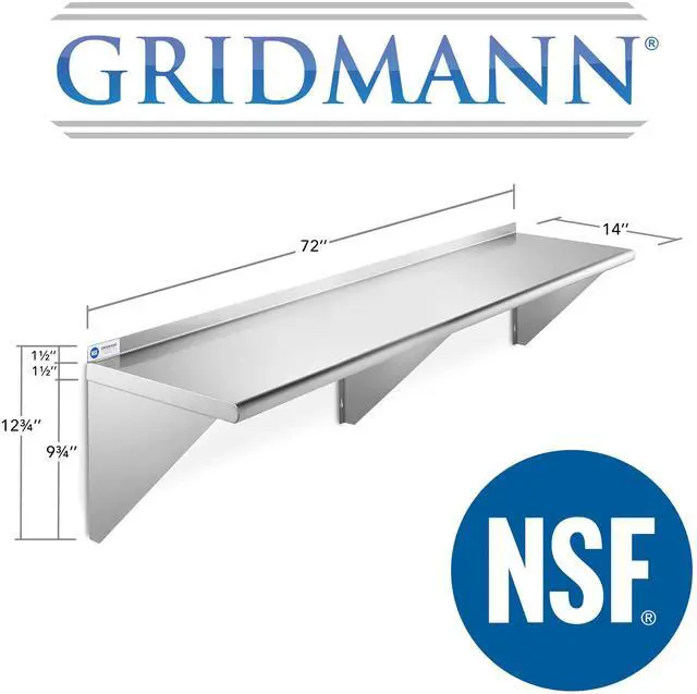 This heavy-duty wall mount shelf by Gridmann is constructed from 18-gauge #430 stainless-steel and is perfect for use in any kitchen, laundry, janitorial room, garage, or anywhere additional storage is needed. It is NSF certified to meet strict standards for public health protection and built for high-volume use to last a lifetime. It features a large, space-saving design that offers plenty of storage as well as a 1-1/2 inch tall backsplash. The front edge is rounded for working comfort and three wall support brackets provide maximum stability.