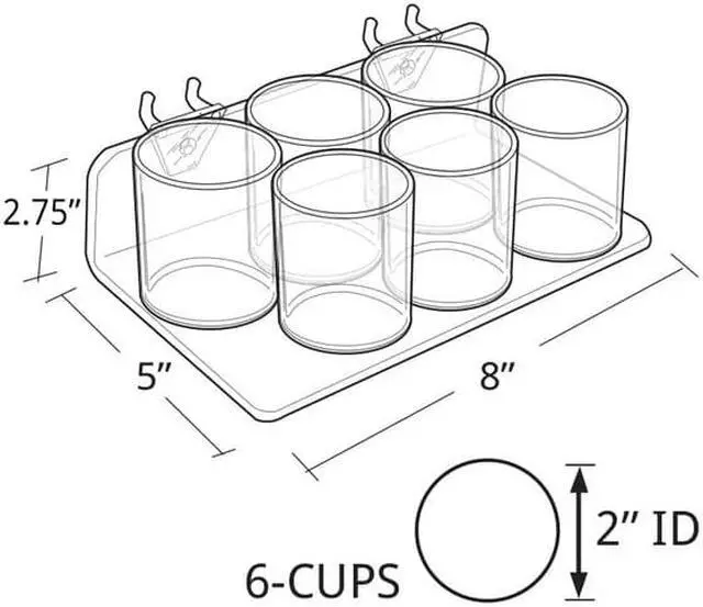 Six-cup display measures 8"W x 5"D x 2.75"H. Each cup measures 2.5"H and 2" in diameter. Use this display on pegboard, slatwall, or counter top. Two plastic hooks attached for easy mounting.