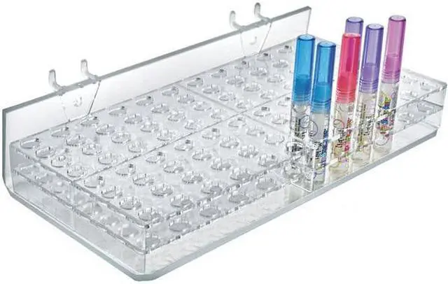 Azar's lipstick and mascara wand trays can be used on pegboard, slatwall, or as a freestanding counter unit.