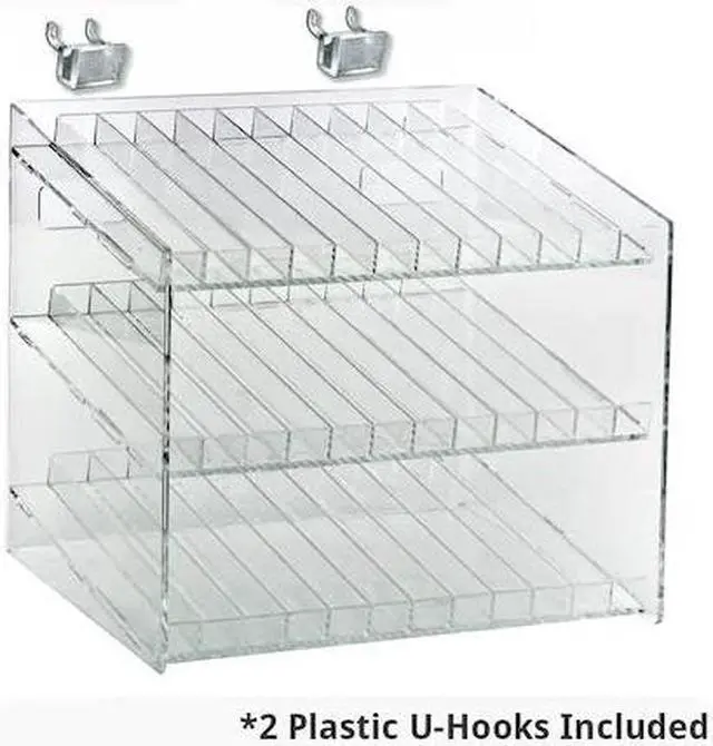 Use these attractive displays on pegboard, slatwall, or countertop to present an assortment of products in a neat and organized arrangement. Choose from two to five tiers, available in four different compartment sizes. Plastic U-Hooks included for use on pegboard and slatwall.