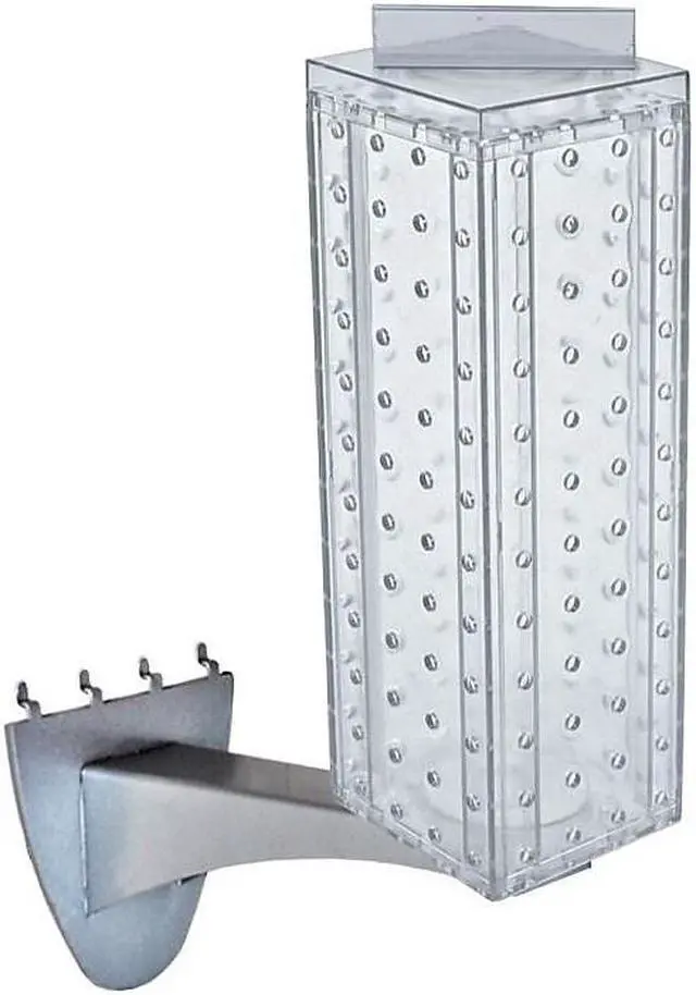 This kit includes an interlocking pegboard tower measuring 4"W x 4"D x 12"H and rotates on an 8" metal extension rod. Use on an existing pegboard/slatwall display. Sign holder and hooks sold separately.