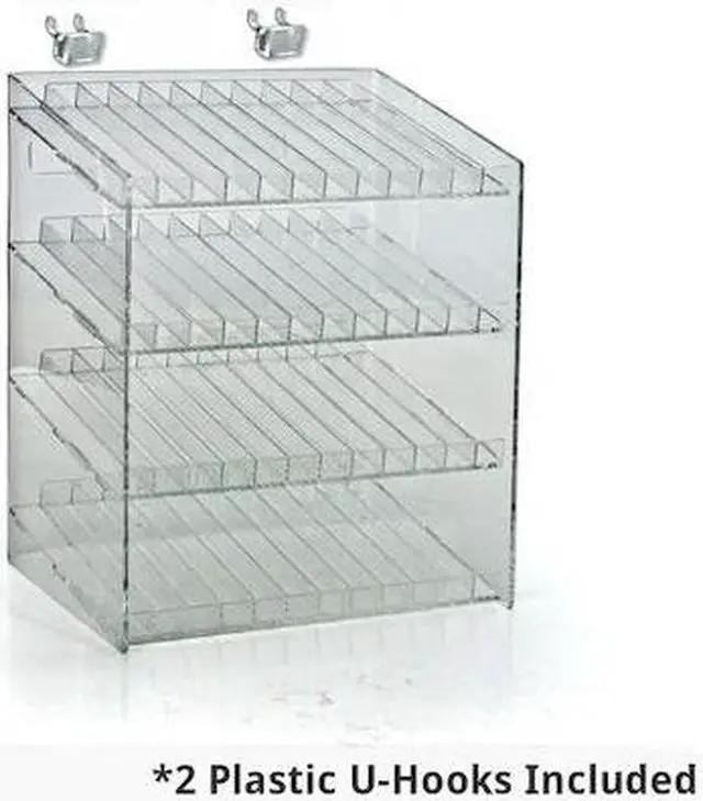 Use these attractive displays on pegboard, slatwall, or countertop to present an assortment of products in a neat and organized arrangement. Choose from two to five tiers, available in four different compartment sizes. Plastic U-Hooks included for use on pegboard and slatwall.