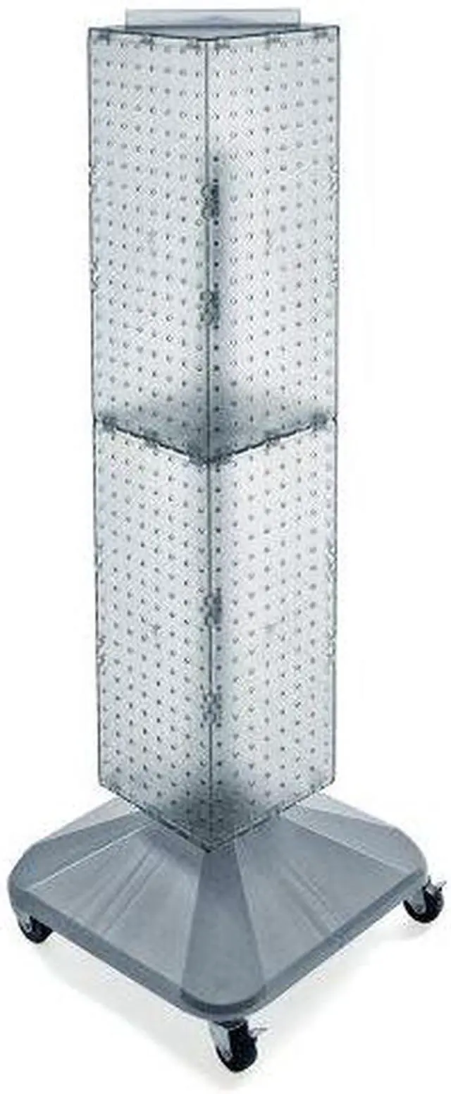 This 4-sided pegboard interlocking Floor Display measures 8" W x 8" D x 40"H and revolves on a silver plastic wheeled base. Easy to assemble (no tools required). Sign holder and hooks sold separately.
