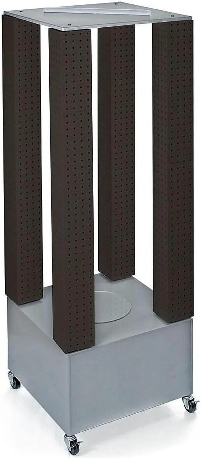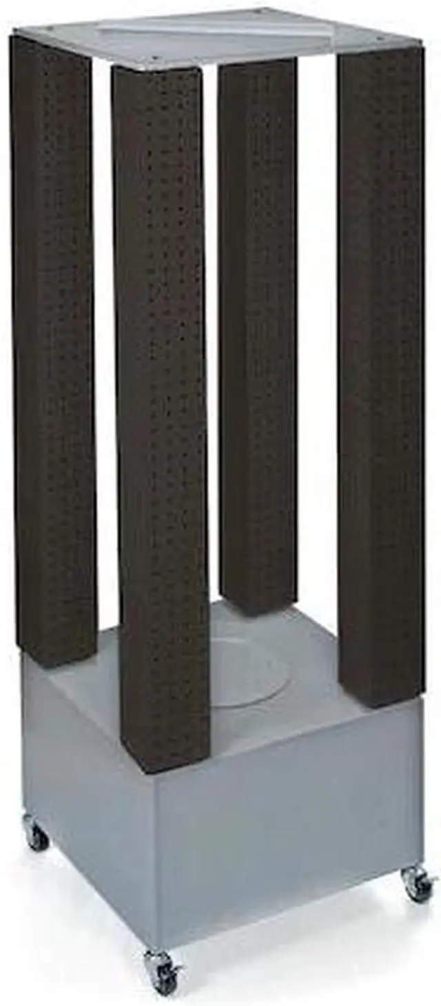 This unit consists of 4 independently revolving 4" W x 4" D x 48" H pegboard towers. The unit comes standard on a silver metal wheeled base. Sign holder and hooks sold separately.