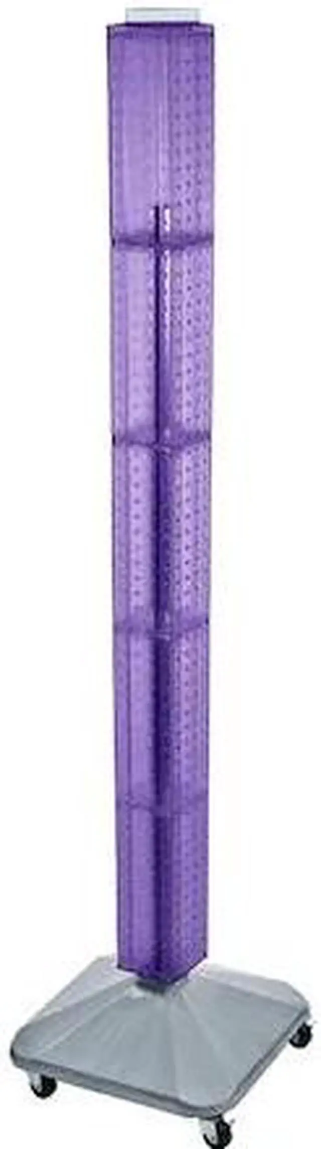 This 4-sided pegboard interlocking floor unit measures 4" W x 4" D x 60" H and revolves on a silver plastic wheeled base. Easy to assemble (no tools required). Sign holder and hooks sold separately.