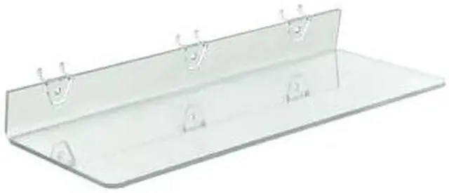This is a Clear Acrylic Shelf that is. 1875" thick. Two plastic hooks are attached to unit for easy display onto any standard pegboard or slatwall system.