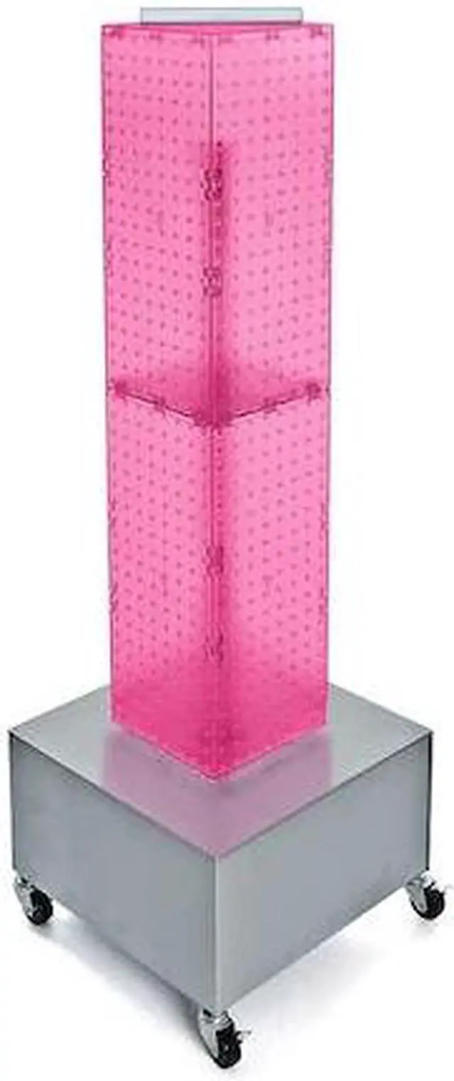 This 4-sided pegboard interlocking Floor Display measures 8" W x 8" D x 40"H and revolves on a silver metal wheeled base. Easy to assemble (no tools required). Sign holder and hooks sold separately.
