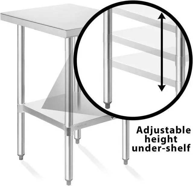 This stainless steel table is NSF certified, guaranteeing a standard level crucial for commercial kitchens, ensuring compliance with stringent food safety requirements. The adjustable galvanized under shelf optimizes storage, keeping essential tools and supplies within reach while maximizing workspace organization. Height adjustable bullet feet enable stability on uneven surfaces, offering a level platform essential for the bustling environment of any professional kitchen.