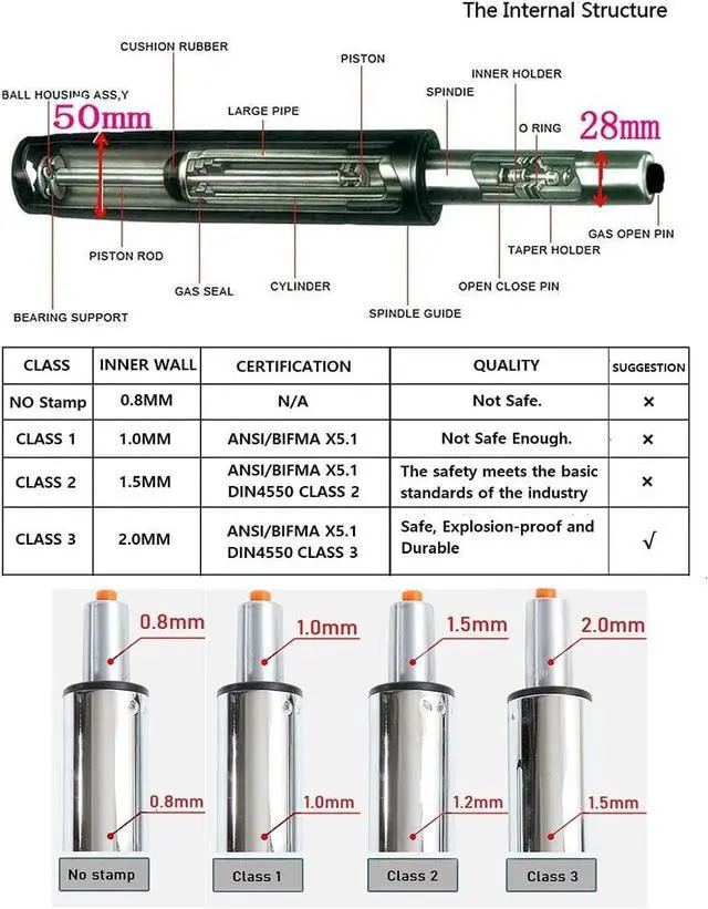 Why do we have to choose Mcdoofly Class 3 gas lift cylinder?Because they pass the US BIFMA X5.1 test and the European German machinery DIN4550class-3(referred to as grade 3 gas rod) test. The required safety factors include the hardness thickness of alloy steel, pure nitrogen explosion-proof gas rod with 2.0 thickness of inner pipe wall, pressure value and pressure category, explosion-proof index and other 48 tests. We hope you understand the importance of gas rod on a chair.