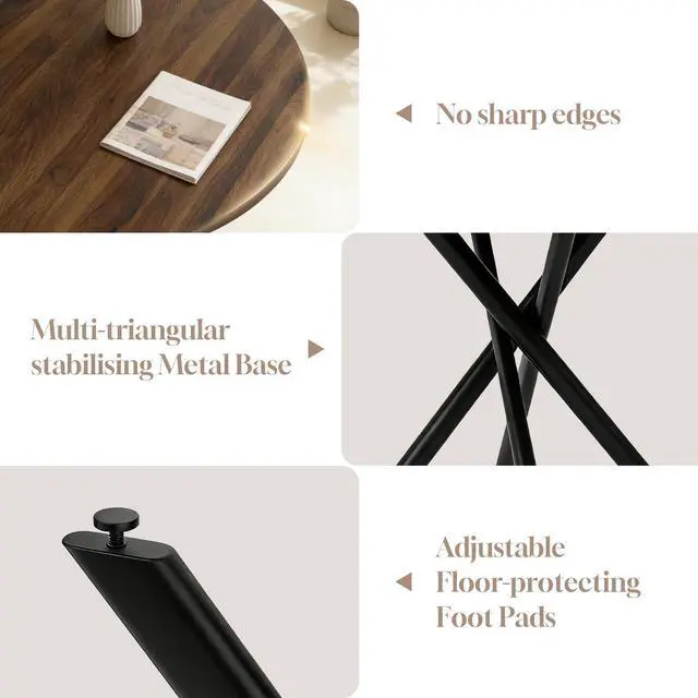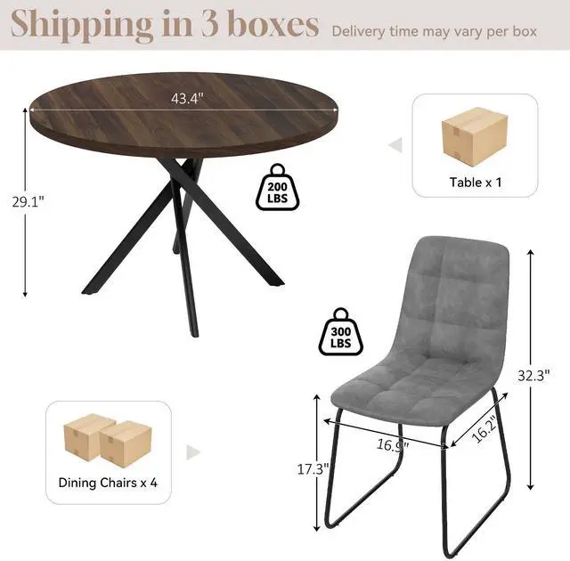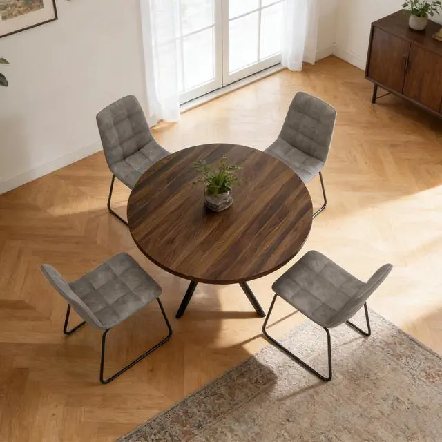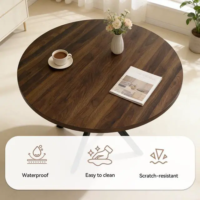 The round table is crafted from thick MDF material with a sturdy X-shaped carbon steel base and non-slip rubber pads, ensuring stability and longevity. The dining chairs feature high-quality PU leather upholstery, ergonomic curved backs, and high elastic sponge for comfort and durability.