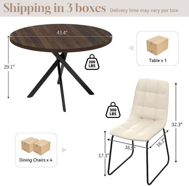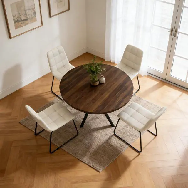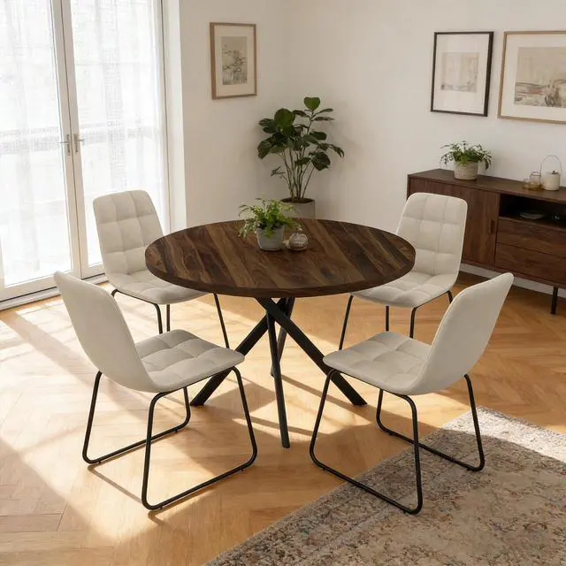 The round table is crafted from thick MDF material with a sturdy X-shaped carbon steel base and non-slip rubber pads, ensuring stability and longevity. The dining chairs feature high-quality PU leather upholstery, ergonomic curved backs, and high elastic sponge for comfort and durability.