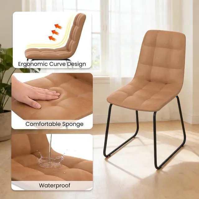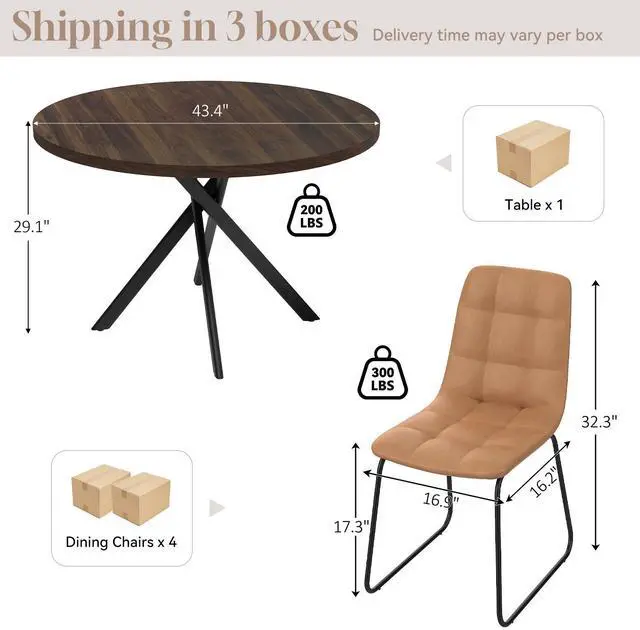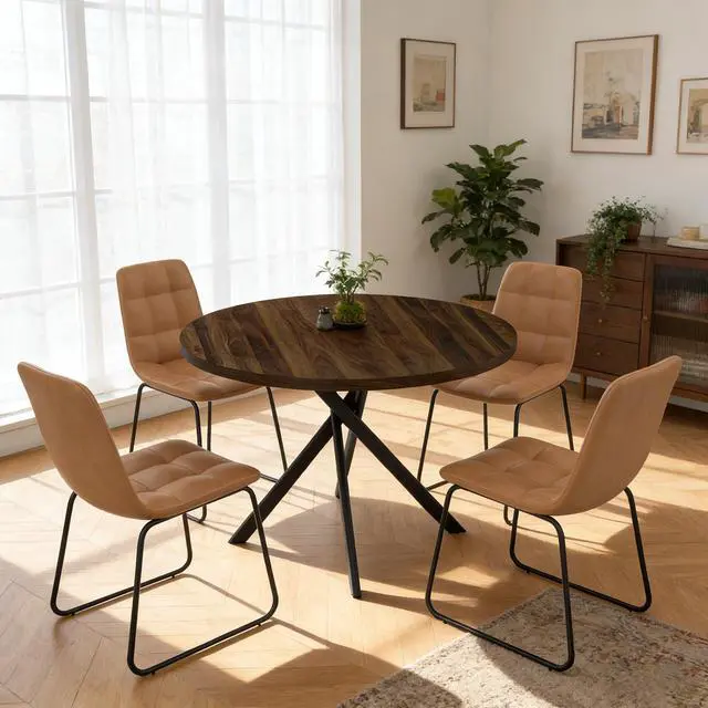 The round table is crafted from thick MDF material with a sturdy X-shaped carbon steel base and non-slip rubber pads, ensuring stability and longevity. The dining chairs feature high-quality PU leather upholstery, ergonomic curved backs, and high elastic sponge for comfort and durability.