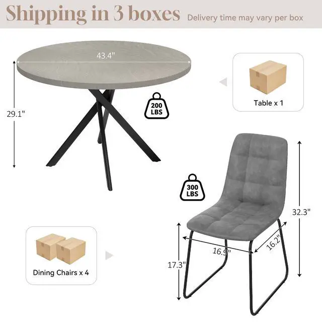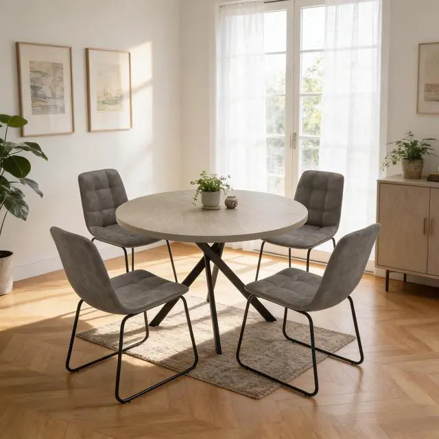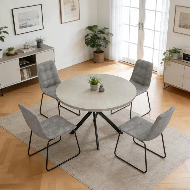 The round table is crafted from thick MDF material with a sturdy X-shaped carbon steel base and non-slip rubber pads, ensuring stability and longevity. The dining chairs feature high-quality PU leather upholstery, ergonomic curved backs, and high elastic sponge for comfort and durability.