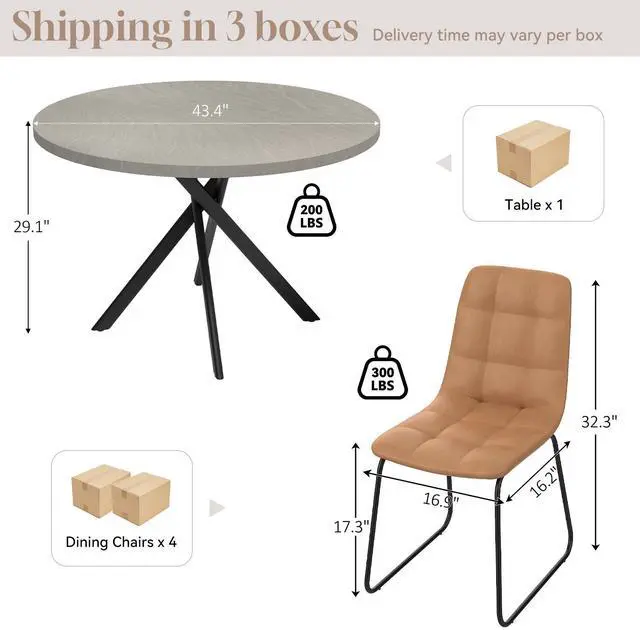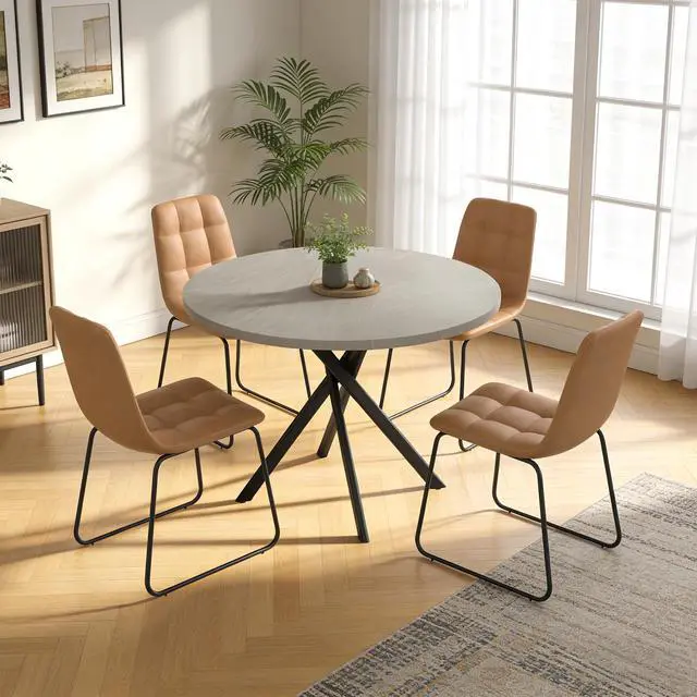 The round table is crafted from thick MDF material with a sturdy X-shaped carbon steel base and non-slip rubber pads, ensuring stability and longevity. The dining chairs feature high-quality PU leather upholstery, ergonomic curved backs, and high elastic sponge for comfort and durability.