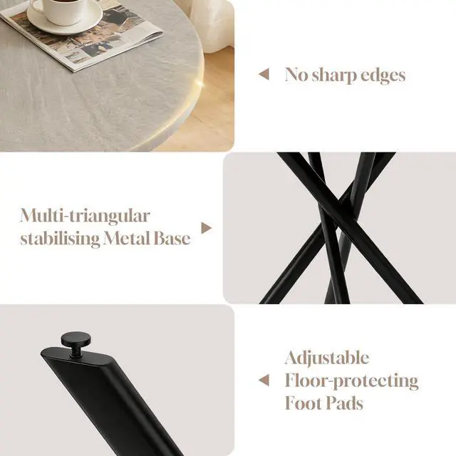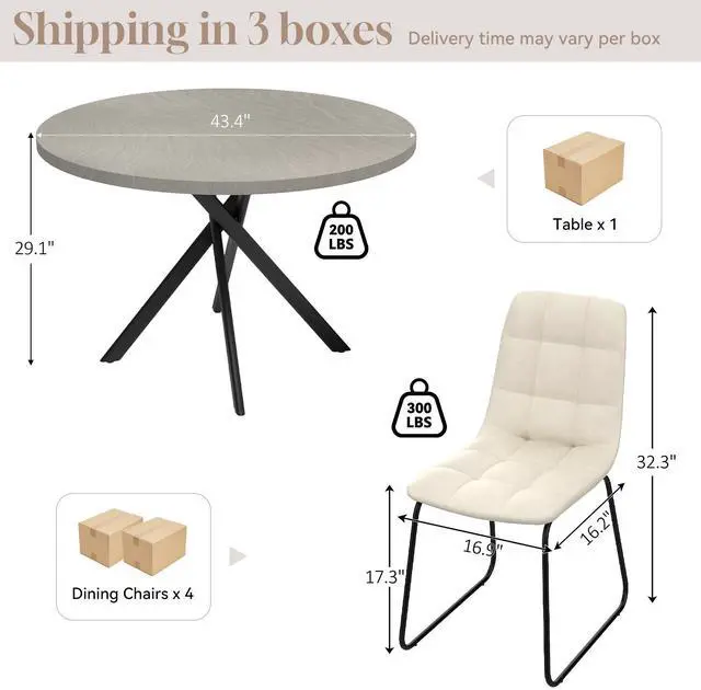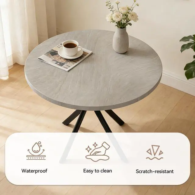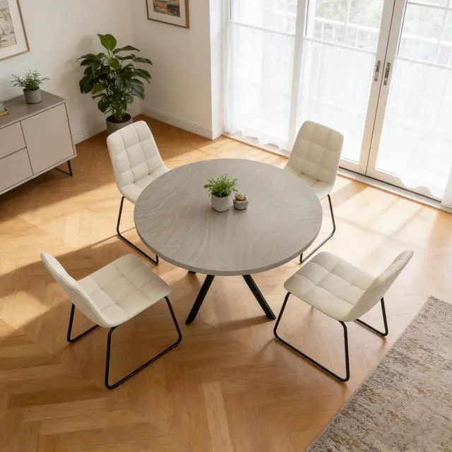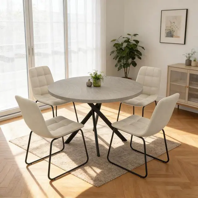 The round table is crafted from thick MDF material with a sturdy X-shaped carbon steel base and non-slip rubber pads, ensuring stability and longevity. The dining chairs feature high-quality PU leather upholstery, ergonomic curved backs, and high elastic sponge for comfort and durability.