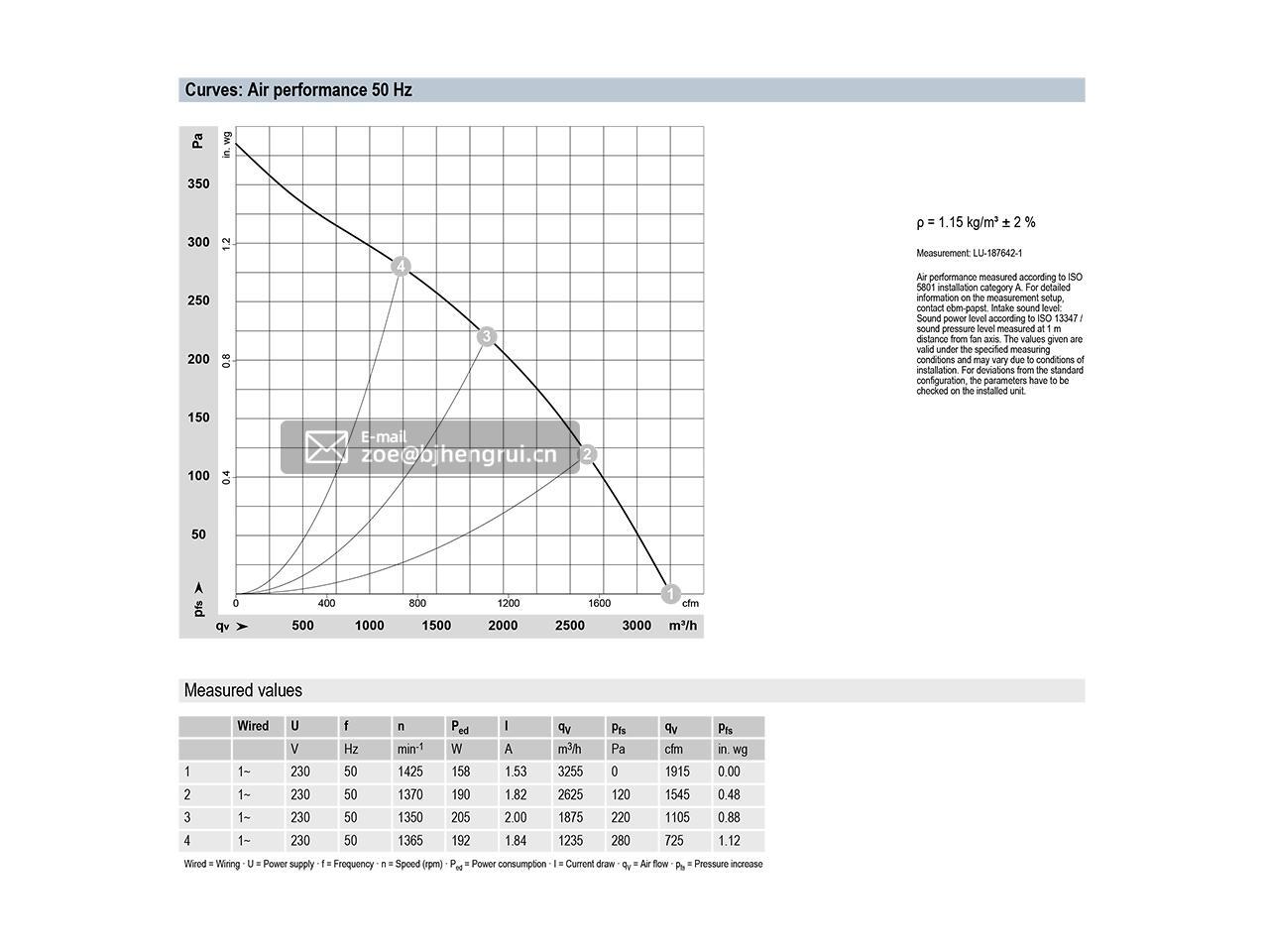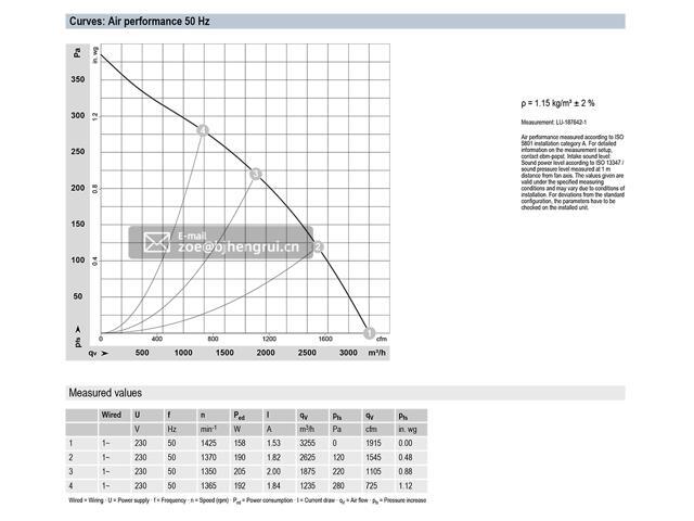 Nominal voltage :230VAC; Nominal voltage rang:200~240VAC; Current draw:2.0A;Speed (rpm) / min-1:1350RPM(r/min); Power consumption / W :205W; Degree of protection: IP54;Insulation class:B;