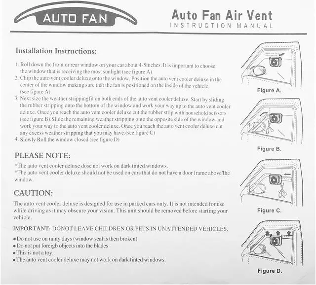 It installs in seconds; and fix with all car windows Place Auto Fan vent on top of window, then close window and lock up. Fresh air is drawn in; while the hot, stale air vents out Auto Fan even helps to eliminate pet and tobacco .