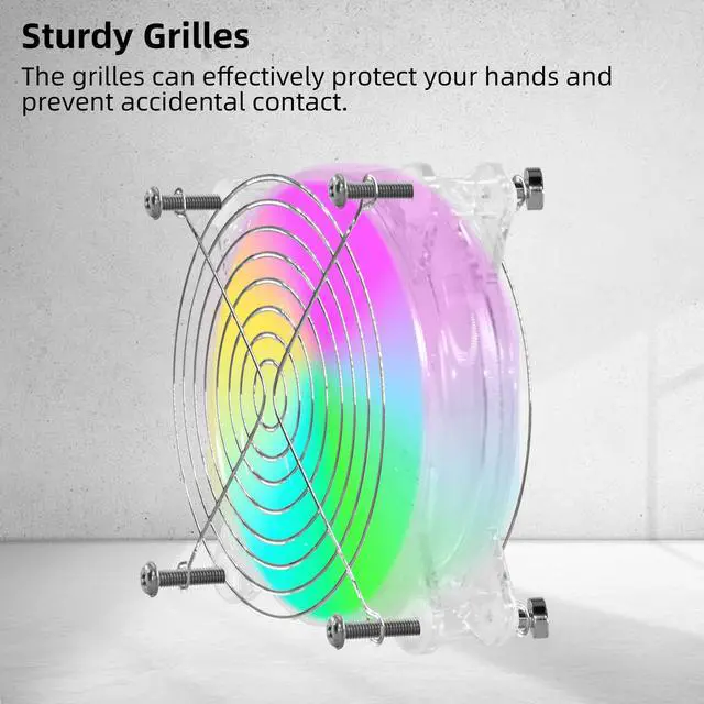 Durable Grilles The 120mm case fan's sturdy silver grilles protect fingers and wires while maximizing airflow, ensuring safe and efficient cooling for gaming consoles, TVs, hard drive case and AV entertainments.