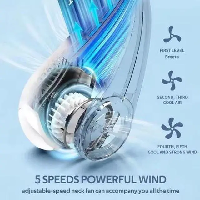 5. Keep cool and comfortable in the summer heat with our Portable Wearable USB Charging Hanging Neck Fan. This innovative fan features 5-speed adjustable high-velocity wind and a rechargeable lithium battery for long-lasting use. Whether you're at home, on the beach, or out for a hike, this fan is the perfect accessory to keep you cool and refreshed. Stay cool and stylish with this essential summer tool.