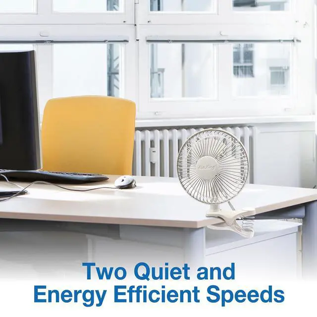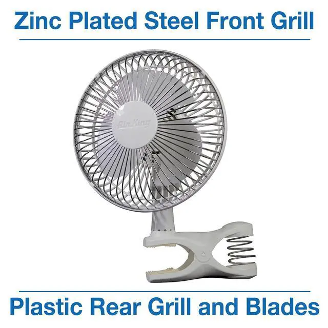 Enjoy a cool breeze with the Air King 6-Inch Commercial-Grade Clip-On Fan. The spring-loaded clip makes the fan easy to attach to a shelf, desk, and more. This fan offers a 120-volt, 1-phase, permanently lubricated motor. Features rear-mounted controls, 2 speeds, a tilting head, and a 6-foot, white SPT type power cord.