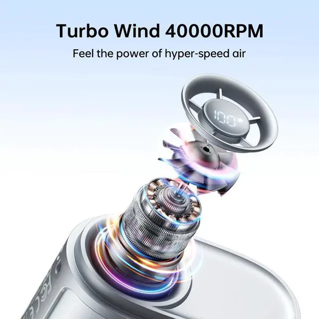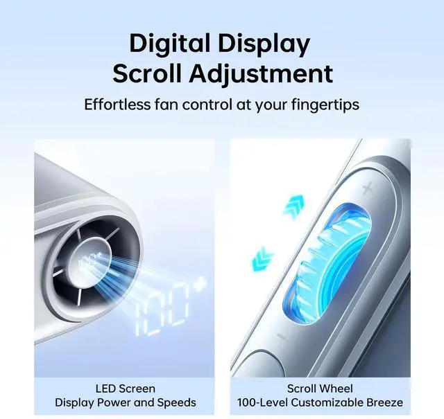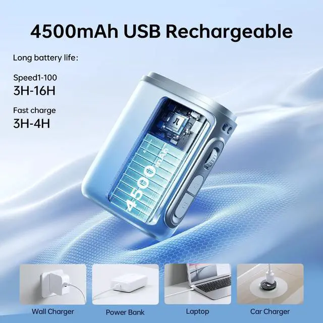 This neck fan features a 9-blade turbo fan and a brushless motor, delivering powerful winds up to 8.5m/s with 100 adjustable speeds to suit various needs. High-performance cooling : 9-blade turbo fan with speeds up to 8.5m/s. Long-lasting battery : 4500mAh battery offers 3-16 hours of use, with quick charging. Smart LED display : Real-time monitoring of wind speed and battery level. Versatile design : Easily convertible to handheld, waist-mounted, or neck-hanging modes, ideal for outdoor activities and travel. Portable and stylish : Compact design with a modern shell for easy carrying, making it a must-have for summer.