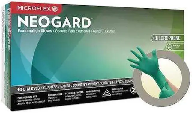 Disposable Gloves, Acceptable Quality Level (AQL) 1.5, Color Green, Cuff Style Beaded, Cuff Thickness 2.8 mil, Disposable Glove Type General Purpose, Features Ambidextrous, Finger Thickness 5.1 mil, Latex-Free Latex-Free, Length 9 3/5 in, Material Neoprene, Medical Glove Type Exam, Palm Thickness 3.9 mil, Powdered/Powder-Free Powder-Free, Silicone-Free Contains Silicone, Standards ASTM D 6977, Sterile/Non-Sterile Non-Sterile, Texture Grain, Texture Location Fingertips